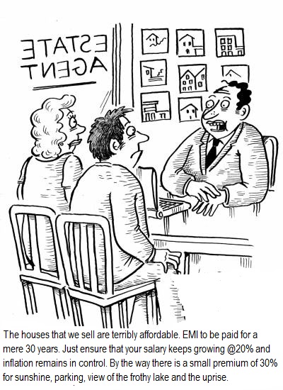 Besides the 15% defraudment (unavoidable premium that one pays for other persons fraud) one has to pay for parking and floor uprise, etc etc. Talking of Bangalore in particular, a typical third grade apartment in a smelly location ends up costing about 20000 (300 USD) per sq ft of carpet area – and by the way you don’t own the piece of that land.